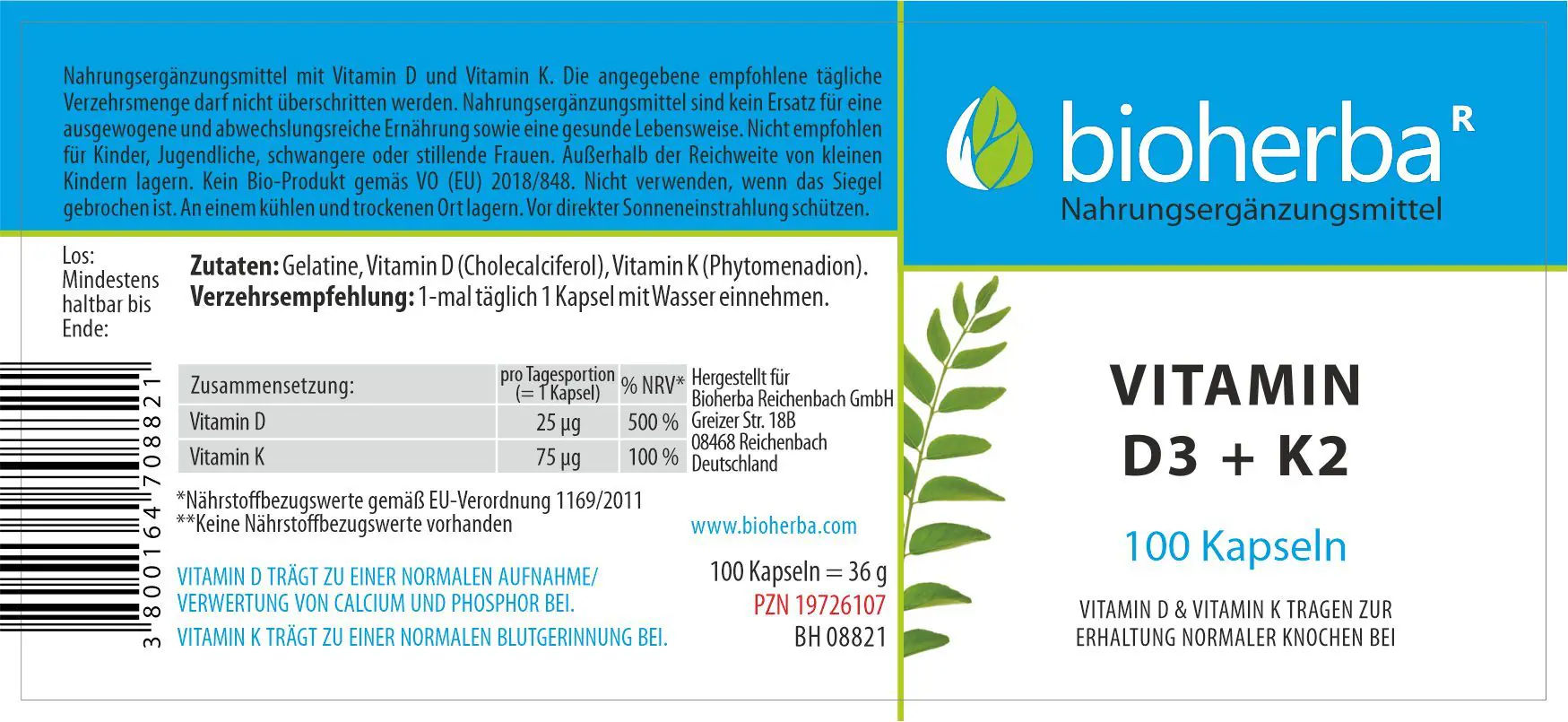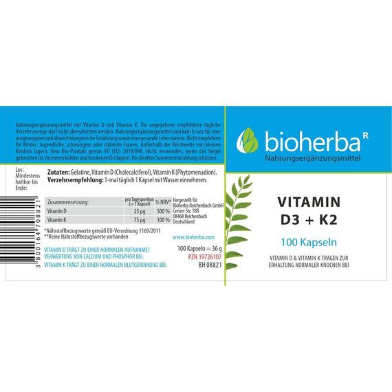 Bioherba Vitamin D3 + K2 Kapseln enthalten eine sorgfältig abgestimmte Kombination der fettlöslichen Vitamine D (Cholecalciferol) und K (Phytomenadion). Diese Vitamine ergänzen sich in ihrer Funktion ideal und sind als tägliche Nahrungsergänzung einfach anzuwenden.
